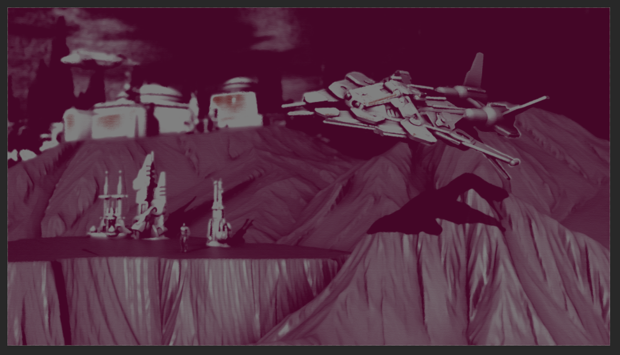 I created a radii composition and placed my models mostly in the foreground and midground and used a photogrammetry capture of a diorama of the Star Wars Galaxy's Edge theme park area by Reverse Imagineering in the background. I color shifted the diorama's texture in Photoshop to match my color palette and applied basic colored materials to my models using aistandard shaders with aiambientOcclusion connected into the base parameter.